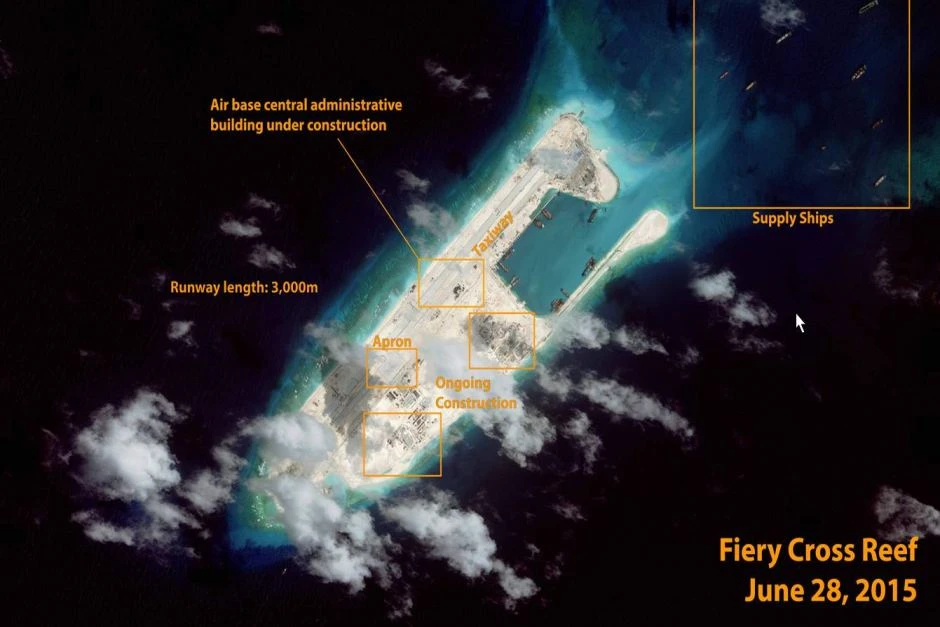 Ảnh chụp ngày 28-6-2015 cho thấy tiến độ bồi đắp và xây dựng trái phép của Trung Quốc, trong đó có một đường băng dài 3.000 m trên đá Chữ Thập thuộc quần đảo Trường Sa của Việt Nam. Ảnh: ABCNEWS