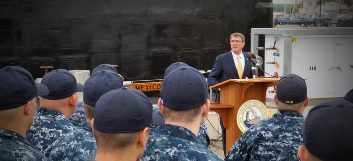 Bộ trưởng Quốc phòng Mỹ Ash Carter phát biểu trước các thủy thủ tại ĐH Chiến tranh hàng hải (Mỹ) ngày 25-5. Ảnh: DEFENSE ONE