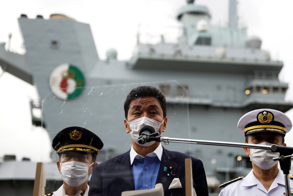 Bộ trưởng Quốc phòng Nhật Nobuo Kishi thăm tàu sân bay Anh hôm 6-9. Ảnh: REUTERS