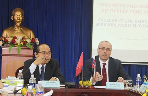 Phó Giám đốc Sở Tư pháp TP.HCM Trần Văn Bảy (trái) và Bộ trưởng Bộ Tư pháp Slovakia Tomas Borecc. Ảnh: cẩm tú