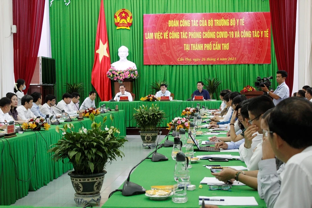 Quang cảnh buổi làm việc của Đoàn công tác do Bộ trưởng Bộ Y tế về công tác phòng chống dịch và công tác y tế tại Cần Thơ chiều 26-4. Ảnh: NHẪN NAM
