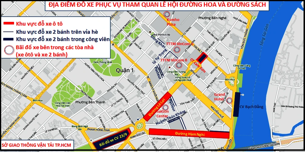 Sở Giao thông vận tải cũng bố trí 27 điểm giữ xe cho người dân tham quan đường hoa, đường sách, gồm 10 bãi giữ xe ô tô và 17 bãi xe máy. Các bãi xe ô tô tại đường Hàm Nghi, đường Lê Lợi, công trường Lam Sơn phía sau Nhà hát TP, Công viên 23-9, thêm sáu bãi đỗ xe trong các khách sạn và trung tâm thương mại như Kumho, Vincom A, Vincom B, CO Saigon Center 65 Lê Lợi, khách sạn Grand (số 8-24 Đồng Khởi), khách sạn Sofitel (Lê Duẩn)...