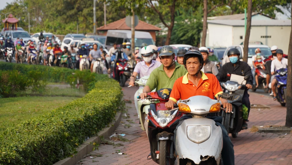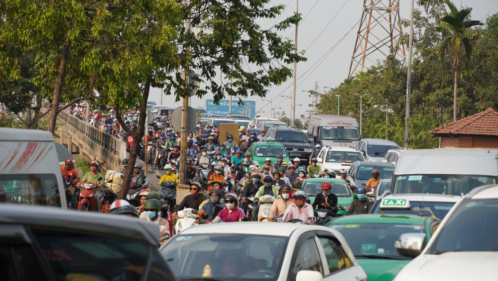 Hàng chục ô tô, xe khách nối đuôi nhau xếp hàng dài la liệt trên đường Đinh Bộ Lĩnh hướng từ Thủ Đức, cầu Bình Triệu về đây. Người đi xe máy cũng không kém phần mỏi mệt, hàng ngàn xe len lỏi chen vào những khoảng trống.
