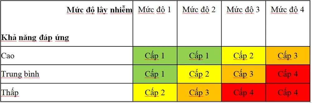 Cấp độ dịch được xác định dựa trên tổng hợp kết quả đánh giá mức độ lây nhiễm (4 mức tại bước 1) và khả năng đáp ứng (3 khả năng tại bước 2), sau đó có thể được hiệu chỉnh bởi chỉ số 1 của tiêu chí 1, theo bảng dưới đây: