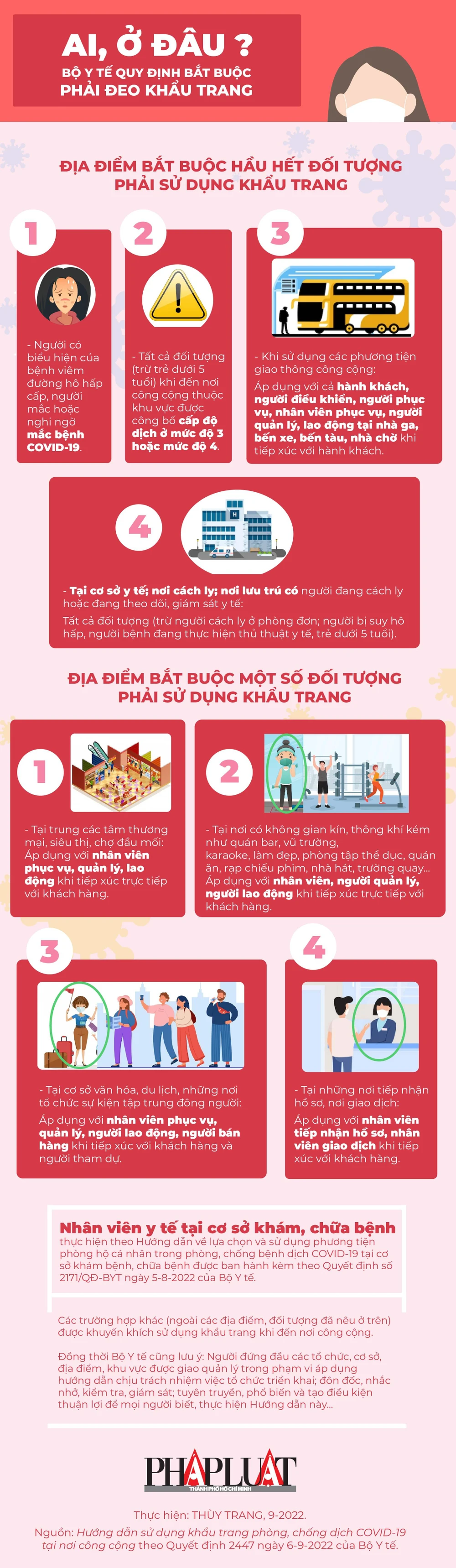 (PLO)-  Theo 'Hướng dẫn sử dụng khẩu trang nơi công cộng', Quyết định số 2447 ngày 6-9-2022 của Bộ Y tế, một số đối tượng, địa điểm sau bắt buộc phải đeo khẩu trang.