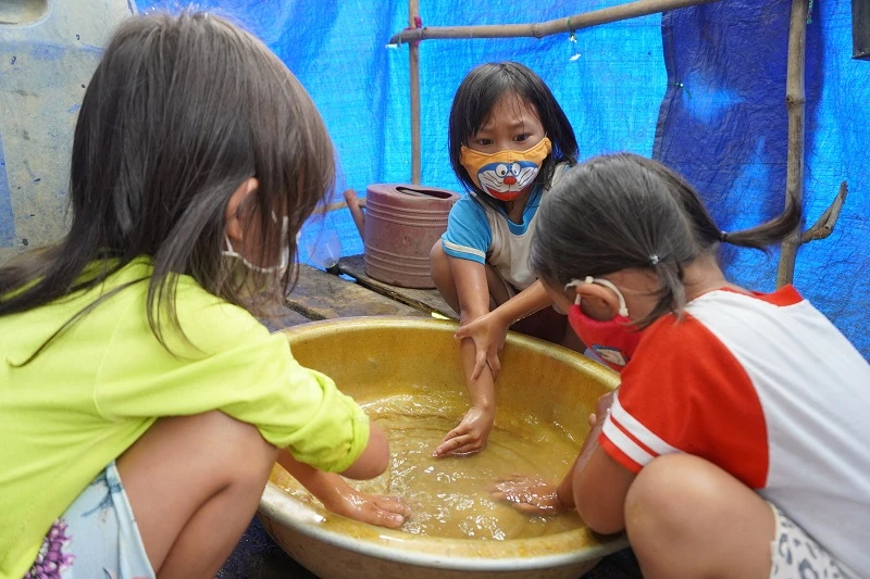 Các em nhỏ ở Quảng Hòa rửa tay trước khi ăn cơm. Ảnh T.H