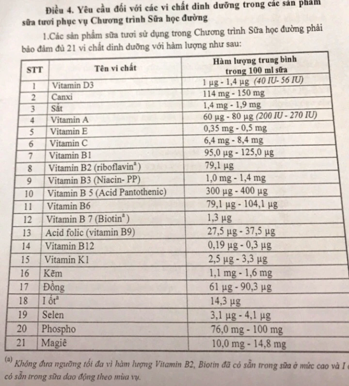 Bộ Y tế quy định sản phẩm sữa tươi sử dụng trong chương trình phải đảm bảo đủ 21 vi chất dinh dưỡng với hàm lượng như trong bảng sau: