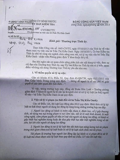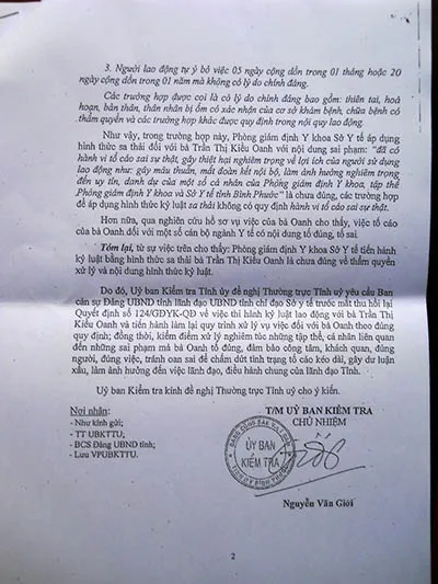 Như Báo Pháp Luật TP.HCM cũng đã thông tin trên nhiều số báo, Thường trực Tỉnh ủy tỉnh Bình Phước đã giao lãnh đạo UBND tỉnh này chỉ đạo kiểm điểm, kỷ luật đúng với mức độ sai phạm của tổ chức, cá nhân có liên quan đến vụ sa thải trái pháp luật đối với bà Trần Thị Kiều Oanh, dược sĩ (DS) tại Phòng giám định y khoa (GĐYK) - Sở Y tế tỉnh Bình Phước.
