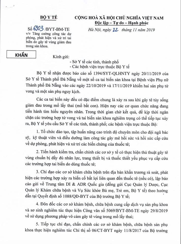 Sau sự việc một sản phụ tử vong, một sản phụ nguy kịch tại BV Phụ Nữ TP Đà Nẵng, nghi do thuốc gây tê Bupivacaine Wpw Spinal 0,5% heavy, ngày 22-11, Vụ Sức khỏe Bà mẹ, Trẻ em - Bộ Y tế tiếp tục có công văn khẩn gửi Sở Y tế các tỉnh, TP, các bệnh viện trực thuộc TP yêu cầu tăng cường công tác dự phòng, phát hiện và xử trí tai biến do gây tê vùng giảm đau trong sản khoa.