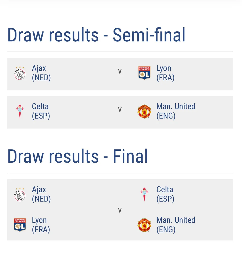 Trong khi đó ở Europa League, Manchester United dễ thở khi chỉ phải gặp Celta Vigo, MU còn có lợi thế được thi đấu trên sân nhà trong trận lượt về. Cặp đấu còn lại là cuộc đối đầu giữa Ajax và Lyon.