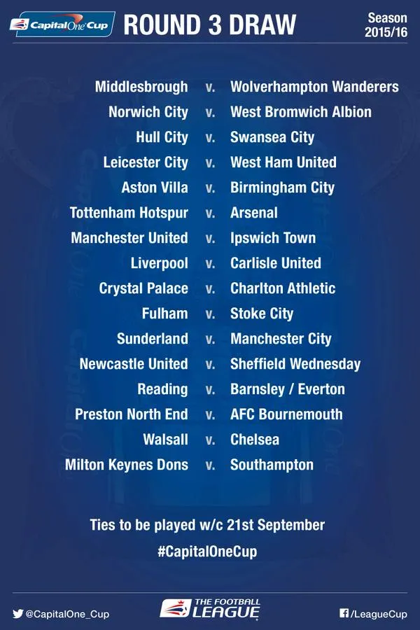 Ở vòng 3 cúp Liên đoàn Anh, M.U và Liverpool sẽ được chơi trên sân nhà lần lượt tiếp Ipswich và Carlisle. Trong khi đó, Chelsea và Man City đá trên sân khách gặp Walsall và Sunderland.