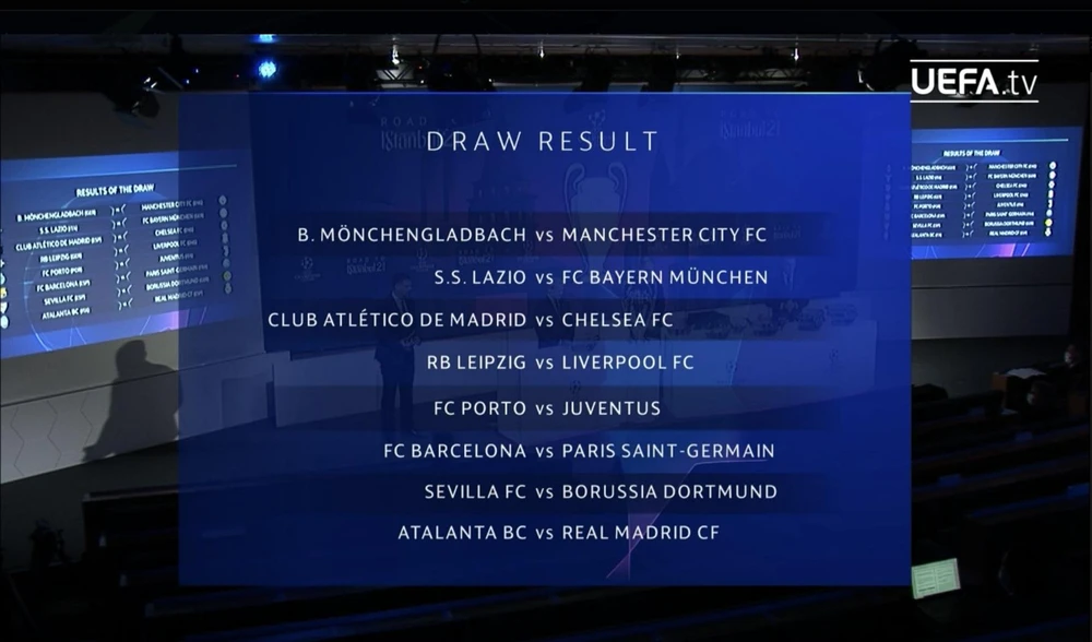 Kết quả buổi lễ bốc thăm như sau Borussia Monchengladbach – Manchester City; Lazio – Bayern Munich; Atletico Madrid – Chelsea; RB Leipzig – Liverpool; FC Porto – Juventus; Barcelona – PSG; Sevilla – Borussia Dortmund; Real Madrid – Atalanta.