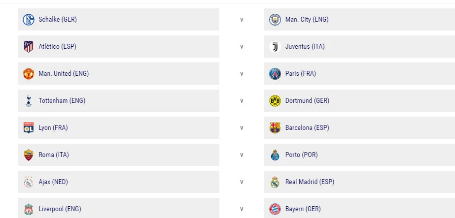 Theo kết quả bốc thăm vừa kết thúc cách đây ít phút, tám cặp đấu vòng 1/8 Champions League gồm Schalke 04 - Manchester City; Juventus - Atletico Madrid; Manchester United - PSG; Tottenham - Borussia Dortmund; Lyon - Barcelona; AS Roma - FC Porto; Ajax - Real Madrid; Bayern Munich - Liverpool.