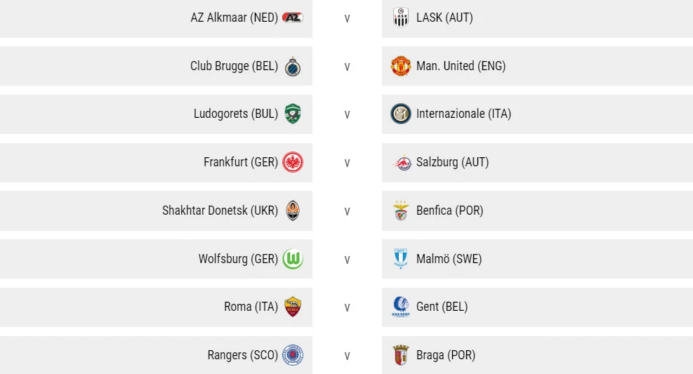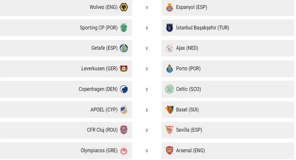 Một số cặp đấu đáng chú ý khác là Getafe - Ajax; Leverkusen - Porto; Roma - Gent; Ludogorets - Inter Milan; CFR Cluj - Sevilla; Shakhtar Donetsk - Benfica; Wolverhampton - Espanyol.