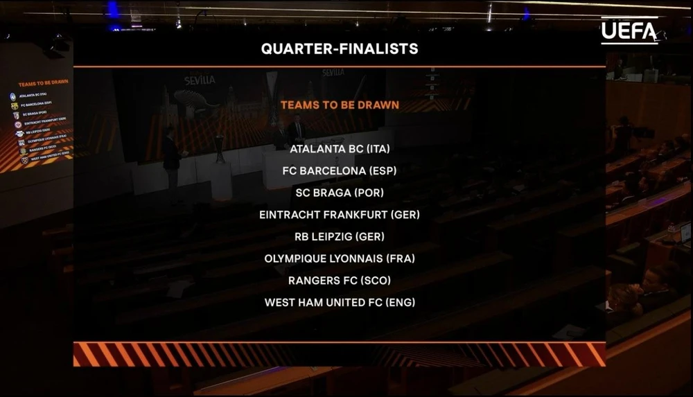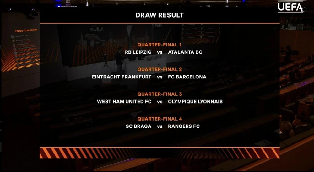 Trước đó, 8 CLB vào tứ kết Europa League được xác định gồm Atalanta, Barcelona, Braga, Eintracht Frankfurt, RB Leipzig, Lyon, Rangers và West Ham. 4 cặp đấu tứ kết Europa League sẽ được bốc thăm theo thể thức ngẫu nhiên, tương tự là 2 cặp đấu bán kết.