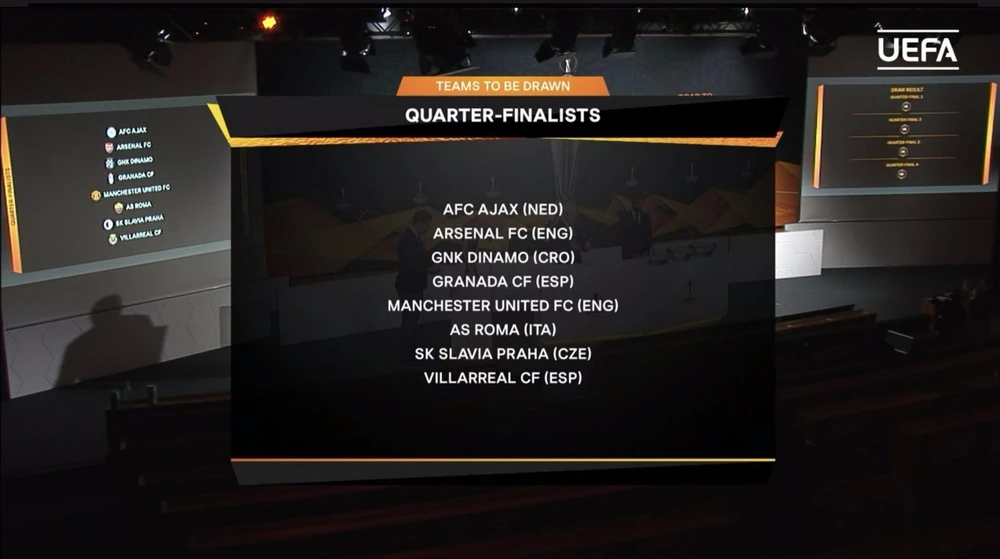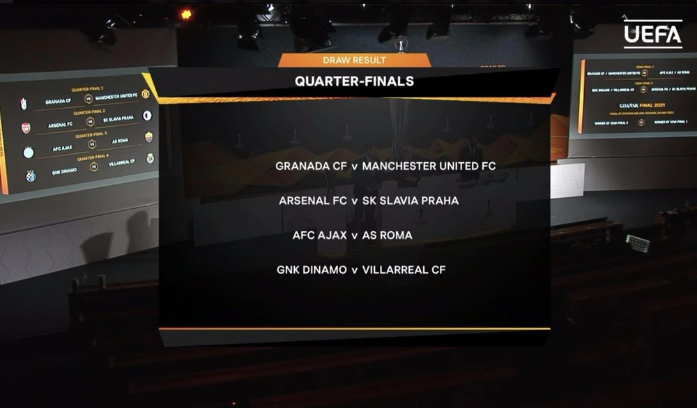 Theo kết quả bốc thăm kết thúc cách đây ít phút, kết quả 4 cặp đấu tứ kết Europa League như sau Granada - Manchester United, Arsenal - Slavia Prague, Ajax – AS Roma và Dinamo Zagred – Villarreal.