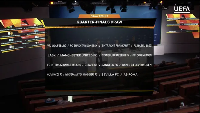 Kết quả bốc thăm vòng tứ kết Europa League vừa kết thúc đã xác định được 4 cặp đấu: Wolfsburg/Shakhtar Donetsk – Eintracht Frankfurt/Basel (tứ kết 1); LASK/Manchester United - Istanbul Basaksehir/Copenhagen (tứ kết 2); Inter Milan/Getafe – Rangers/Leverkusen (tứ kết 3); Olympiacos/Wolves – Sevilla/Roma (tứ kết 4).