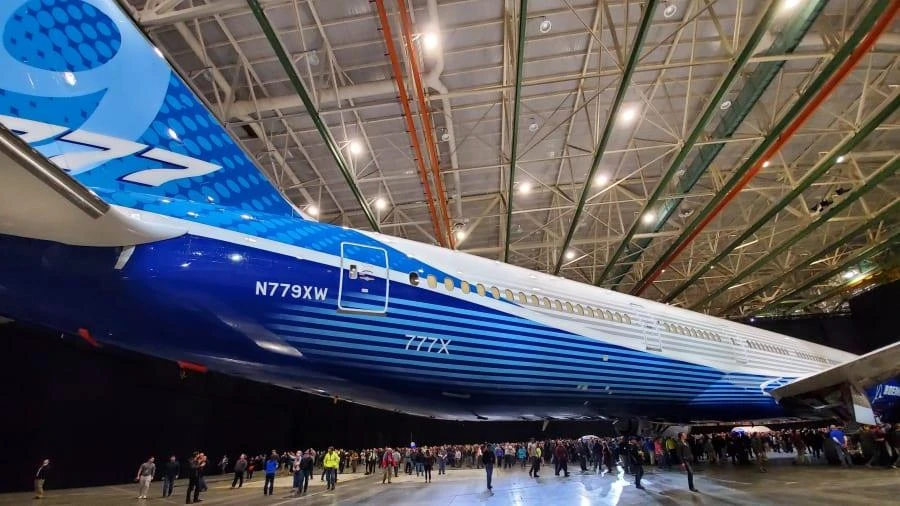 Chiếc máy bay 777X-9 có độ dài gần 77m từ mũi đến đuôi, được trang bị động cơ lớn nhất, có sải cánh rộng nhất so với các dòng trước giờ của Boeing.