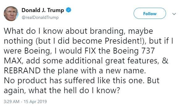 Ý tưởng đổi thương hiệu 737 Max đã được Tổng thống Donald Trump nêu ra trên một dòng Twitter hồi tháng 4.