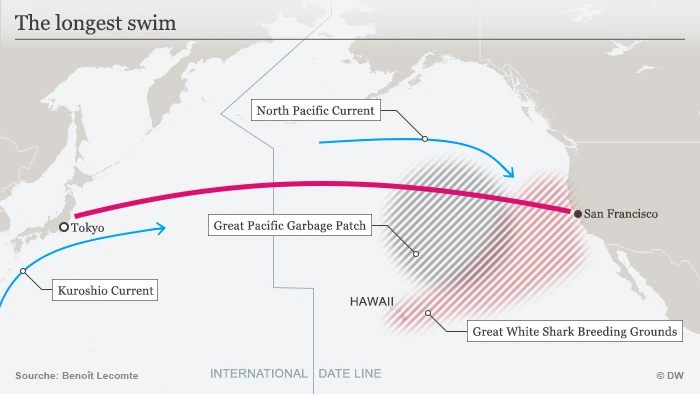 Về hành trình bơi của mình từ ngoài khơi San Francisco đến Tokyo đều là vùng cá mập tập trung rất đông, Lecomte nói: “Tôi chả sợ gì cả. Tôi muốn tìm đâu là giới hạn tột cùng của tôi trong chuyến hải trình đầy thách thức này. Tôi là mạng… con hổ, tôi đã lên kế hoạch cho chương trình chinh phục có một không hai này bảy năm rồi”.