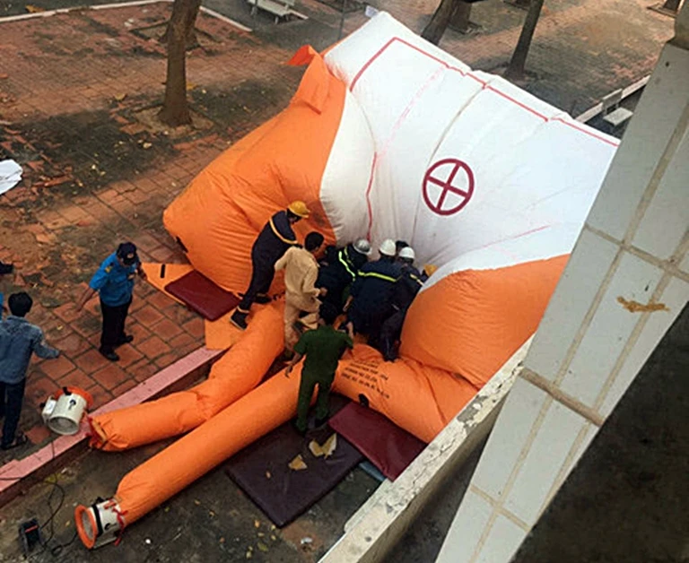 Lực lượng Cảnh sát PCCC và cứu nạn cứu hộ Công an Bình Thuận tại hiện trường vừa thuyết phục vừa khẩn trương bơm phao cứu hộ đặt phía dưới.
