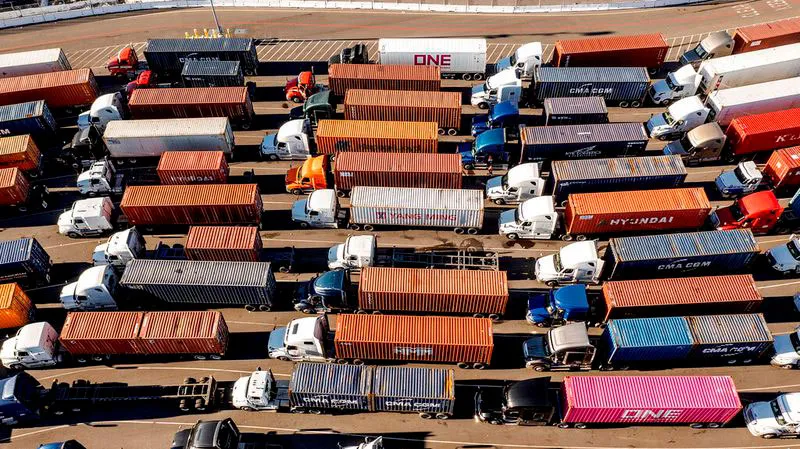 Xe container kẹt ở khu vực cảng Oakland, bang California (Mỹ) hồi tháng trước. Ảnh: AP