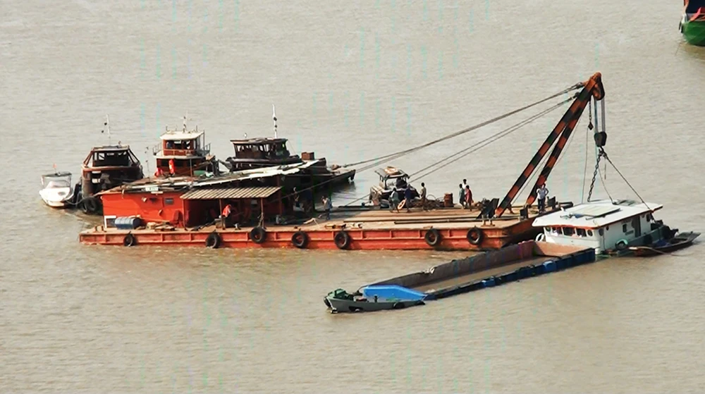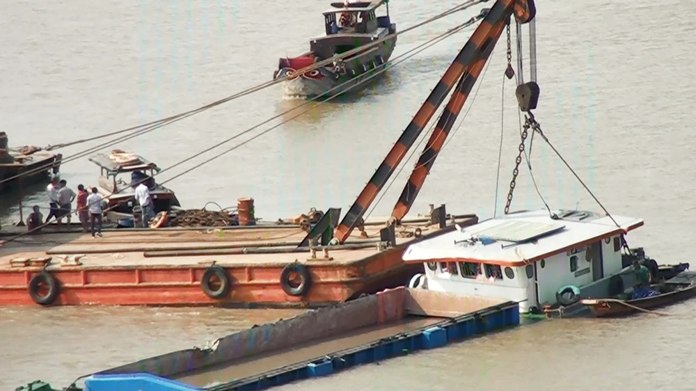 Chiều 19-4, lực lượng chức năng trục vớt sà lan bị chìm trong vụ va chạm với một phương tiện khác vào rạng sáng cùng ngày. Ảnh: NGUYỄN TÂN