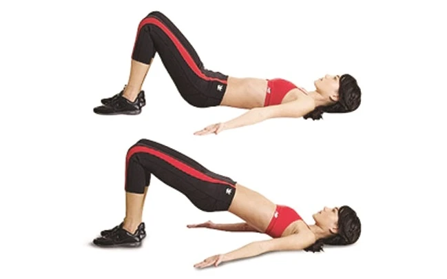 Đây là tư thế bắt đầu. Nâng phần hông lên cao cho đến khi cơ thể trở thành một đường thẳng từ vai đến đầu gối (b). Tạm dừng, sau đó hạ cơ thể về tư thế bắt đầu. Động tác hoàn thành. Thực hiện 10 lần. Có thể dùng lực qua gót chân để đẩy cao và kích thích cơ mông được nhiều hơn.