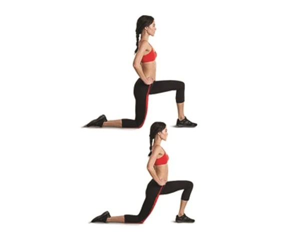 (a). Nhẹ nhàng đẩy hông ra phía trước, đồng thời giữ thẳng phần thân trên (b). Bạn sẽ cảm thấy phần cơ phía trước của hông phải được duỗi ra. Giữ nguyên trong 30 giây, sau đó đổi chân và lặp lại.