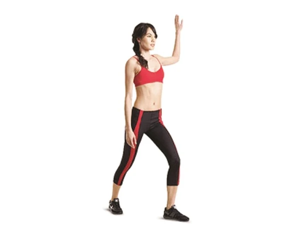 Động tác 3: Đứng thẳng, phần thân trái đối diện một bức tường. Gập khuỷu tay trái thành góc vuông và đặt lòng bàn tay cùng với cẳng tay lên tường.