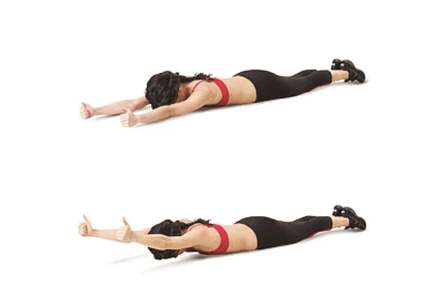 Bốn động tác này sẽ duỗi cơ ngực và làm mạnh cơ lưng trên (để thư giãn sau một ngày ngồi nhiều đồng thời cải thiện dáng đứng) cũng như kích hoạt cơ mông, kích thích cơ bụng, và duỗi cơ gấp ở hông (tất cả các yếu tố này giúp điều chỉnh tư thế và giảm mỡ bụng). Hãy thực hiện những động tác này từ 2 - 3 lần theo đúng thứ tự: