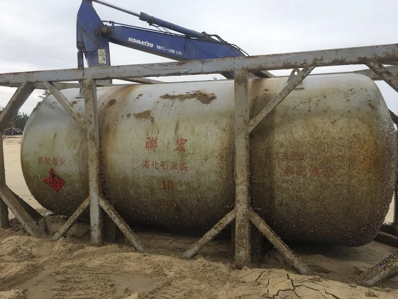 Vào sáng cùng ngày 7-11, người dân xã Điện Dương (thị xã Điện Bàn, Quảng Nam) phát hiện một bồn kim loại có in chữ Trung Quốc trôi dạt vào bờ biển nên trình báo cơ quan chức năng.