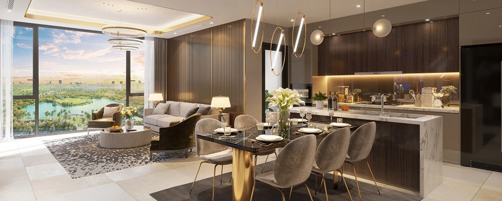 Phòng khách và phòng ăn liên thông đối diện công viên 14ha xanh mát