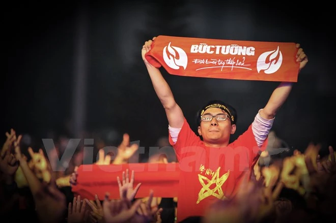 Đã rất lâu Hà Nội mới có được một đêm nhạc rock sôi động và máu lửa như thế. Dù thời tiết rất lạnh lại có mưa phùn nhưng hàng ngàn khán giả đã "cháy" hết mình với Trần Lập và ban nhạc Bức Tường. (Ảnh: Minh Sơn/Vietnam+)