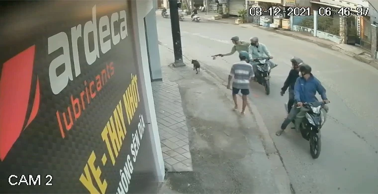 Liền đó, hai thanh niên ngồi sau xe cùng tới phối hợp để lấy con chó trước mặt ông Đức. Một người dọa dùng chích điện bắn khiến ông Đức bỏ chạy.