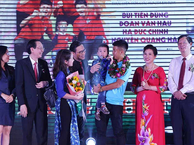 Đáp lại lời chúc của chú Chinh, Nguyễn Bá Thiện Vinh thật ngây ngô: “Chúc mừng các chú, VN vô địch!”. Câu nói hồn nhiên lan tỏa mạnh mẽ đến hàng ngàn cổ động viên bóng đá VN hiện diện tại đêm hội.