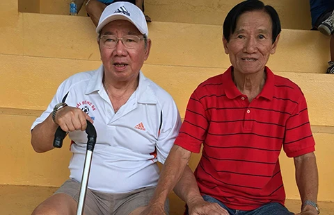 Cựu tuyển thủ Tư “béo” (trái) và Hồ Thanh Cang dự khán trong trận đấu nhân ngày giỗ cố tuyển thủ Đỗ Thới Vinh. Ảnh: CT