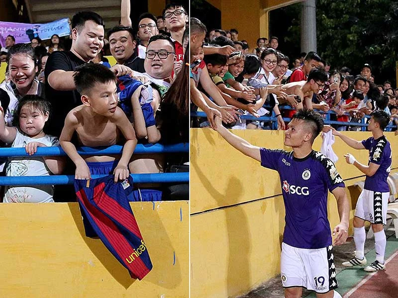 Rất nhiều người hâm mộ ở Hà Nội chờ và xin bắt tay, xin chữ ký của Quang Hải, Duy Mạnh và cũng rất nhiều phụ huynh bây giờ muốn con em mình theo những tấm gương tiêu biểu đấy.