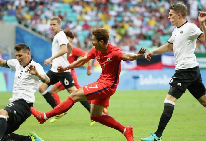 Hàn Quốc (áo đỏ) khiến Đức bở hơi tai mới có trận hòa.