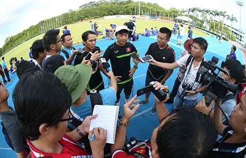 HLV Miura hiểu được tính chất cuộc chơi ở SEA Games qua việc báo giới săm soi ông cùng các cầu thủ U-23 Việt Nam. Ảnh: ANH PHƯƠNG