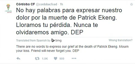 CLB cũ của Ekeng tại Tây Ban Nha là Cordoba cũng bày tỏ sự đau buồn trên tài khoản Instagram chính thức của họ, “Không có từ ngữ nào để diễn tả nỗi đau của chúng tôi trước cái chết của Patrick Ekeng. Chúng tôi rất tiếc thương trước mất mát này. Bạn bè sẽ không bao giờ quên bạn”.