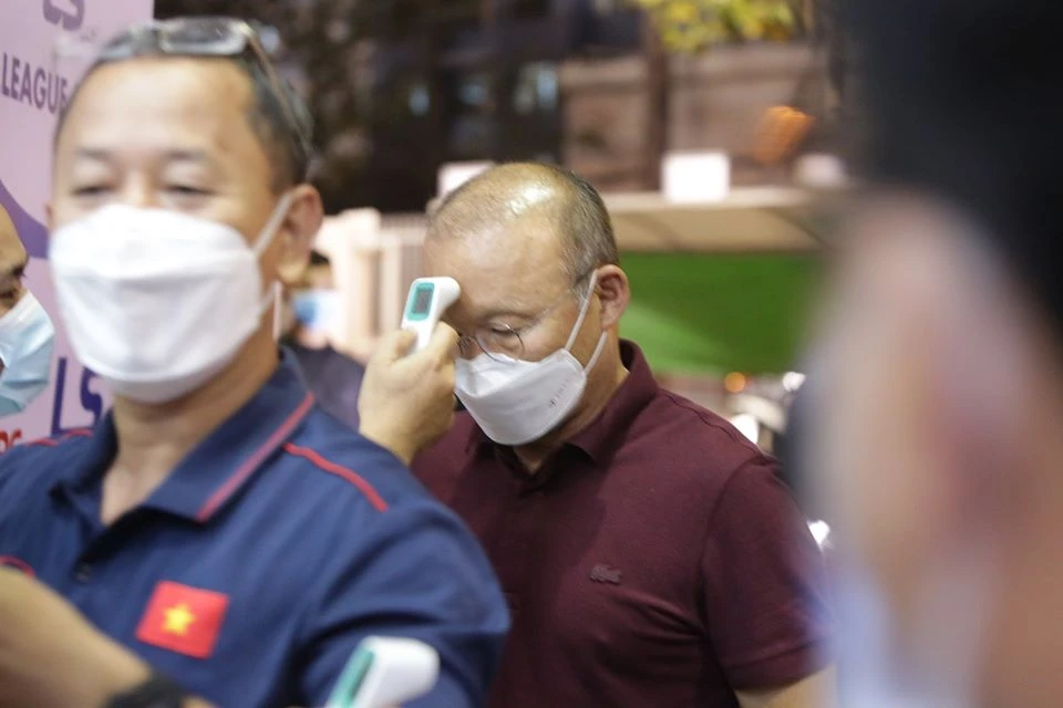 HLV Park Hang-seo được kiểm tra thân nhiệt trước khi vào xem. Ảnh: NT
