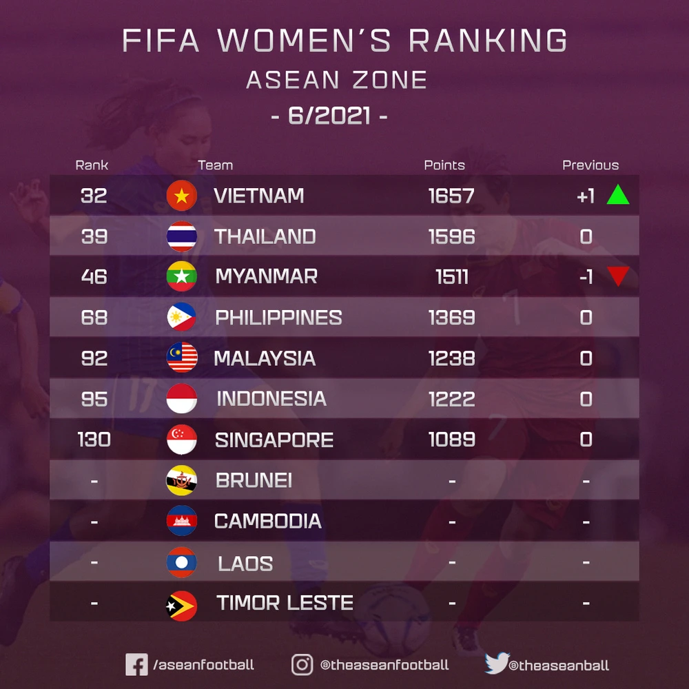 FIFA mới công bố bảng xếp hạng bóng đá nữ thế giới. Theo đó, đội tuyển nữ Việt Nam vẫn giữ vững vị trí số 1 Đông Nam Á ở hạng 32 thế giới, tăng một bậc so với tháng 5-2021.
