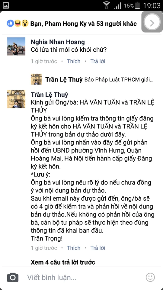 Trong một bình luận sau đó, chị Thùy copy lại nội dung email gửi ông bà “Hà Văn Tuấn và Trần Lệ Thủy”, đề nghị kiểm tra thông tin giấy đăng ký kết hôn trong dự thảo kèm theo.