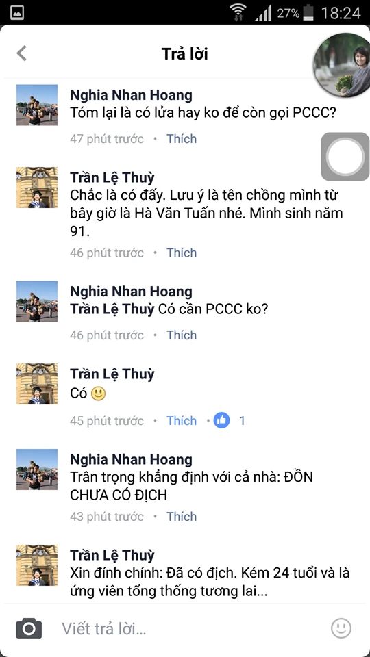 Facebooker Trần Lệ Thùy nhanh chóng trả lời: “Chắc là có đấy. Lưu ý tên chồng mình từ bây giờ là Hà Văn Tuấn nhé. Mình sinh năm 91”. Để trả lời một bình luận nói “đồn vẫn chưa có địch”, chị Thùy hài hước: “Xin đính chính: Đã có địch...”.
