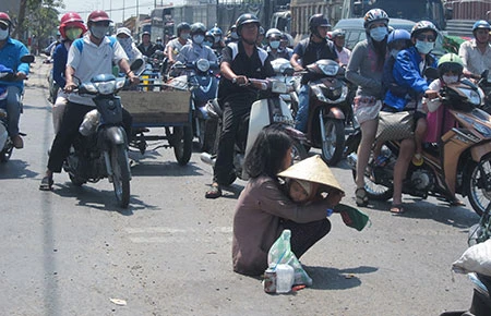 “Tại ngã tư Trung Chánh (phường Trung Mỹ Tây, quận 12, TP.HCM) có một phụ nữ bồng một đứa bé ngồi hẳn xuống lòng đường để xin tiền.