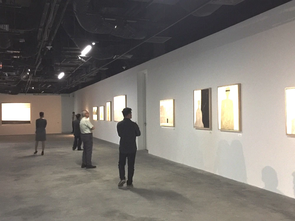 Người xem chiêm ngưỡng các bức tranh tối giản của họa sĩ Lê Thiết Cương.
