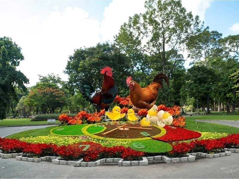Tiểu cảnh gia đình gà thể hiện sự sung túc ở hội hoa xuân năm nay. Ảnh: Công ty Công viên Cây xanh TP.HCM