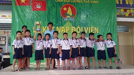Thầy hiệu trưởng Trường Lương Thế Vinh và giáo viên chủ nhiệm trao cúp, huy chương vàng cho đội vô địch 2B sáng 25-4