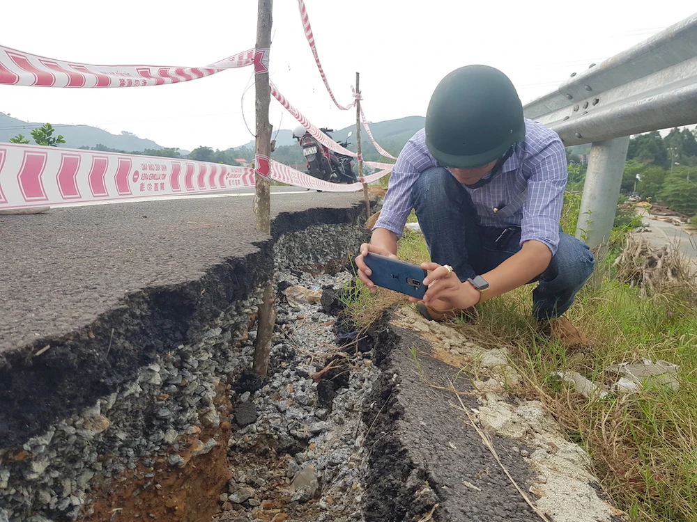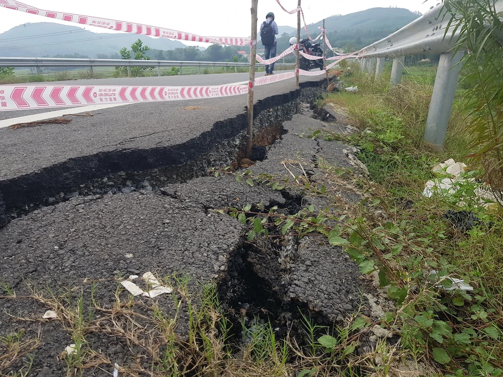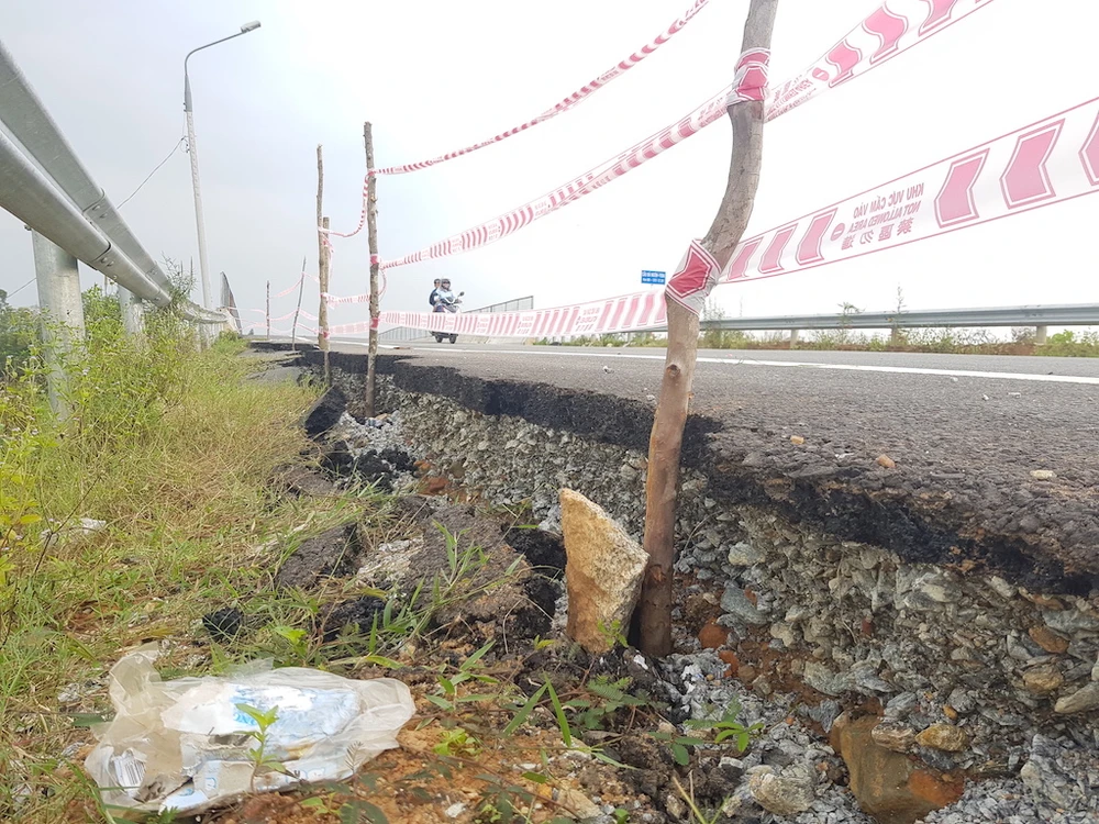 Đến ngày 7-11, các vết sụt lún, nứt toác kéo dài gần 40 m, rộng khoảng 50 cm, sâu hơn so với mặt đường khoảng 40 cm tại đường dẫn lên cầu Bà Ngôn, cầu vượt đường cao tốc Đà Nẵng - Quảng Ngãi vẫn chưa được sửa chữa.